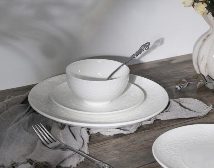 Elevate your dining experience with our exquisite collection of White Embossed Ceramic Tableware. Each piece is meticulously crafted with intricate embossed patterns, adding a touch of elegance and sophistication to your tabletop. The pristine white color creates a clean and refined ambiance, making it perfect for both casual meals and formal gatherings. Our high-quality ceramic material ensures durability and longevity, while the textured surface provides a secure grip and prevents slippage. Impress your guests and add a stylish charm to your dining setting with our stunning white embossed ceramic tableware.