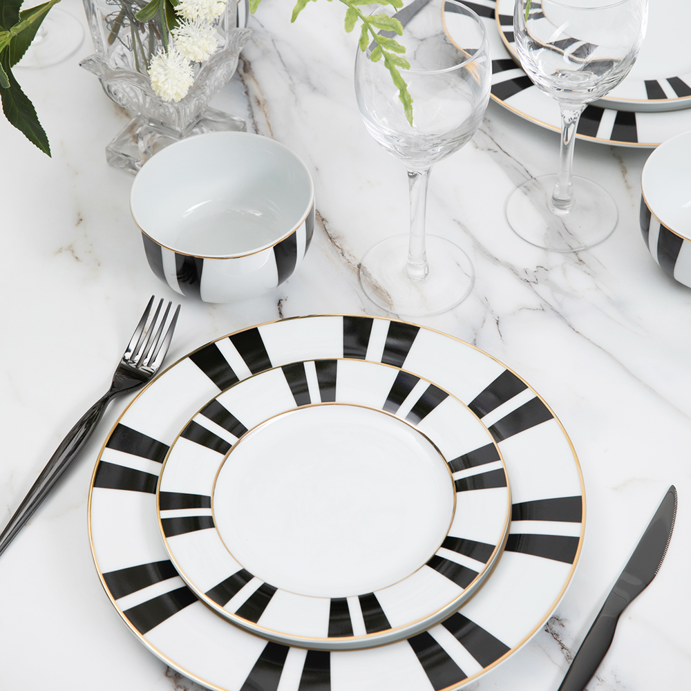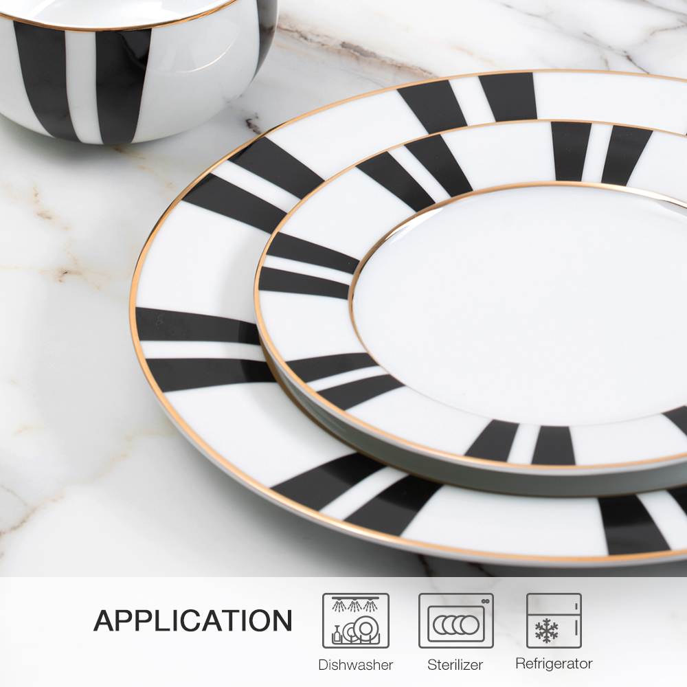 This black and gold line high temperature ceramic tableware set is specially designed for you who pursue quality life. With deep black glaze as the base and 24K gold glaze hand-painted lines, it shows low-key and luxurious modern aesthetics in the flow of light and shadow.