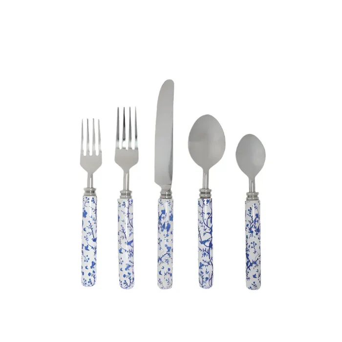 The third set incorporates a classic blue and white color scheme. Blue floral and foliage patterns freely unfold across the pristine white handles, resembling a vibrant ink painting. The stainless steel cutlery exudes a cool yet sophisticated luster, complementing the soft, elegant handles. Whether used for everyday meals or special occasions, these cutlery pieces add a touch of freshness and elegance to any table, bringing the vitality and beauty of a spring garden to life.