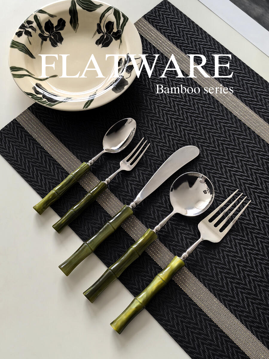 The second set of tableware features a natural, fresh aesthetic. Its olive-green handles emulate the form and texture of bamboo, evoking the refreshing scent of a mountain forest. Stainless steel tableware embodies the sophistication of modern craftsmanship, a combination that creates a natural, rustic feel while retaining the sharpness of metal. Paired with a simple placemat and a plate featuring a botanical pattern, it instantly creates a tranquil and comfortable dining atmosphere, evoking the feeling of being transported deep within a tranquil bamboo forest, transforming dining into a relaxing moment of connection with nature.