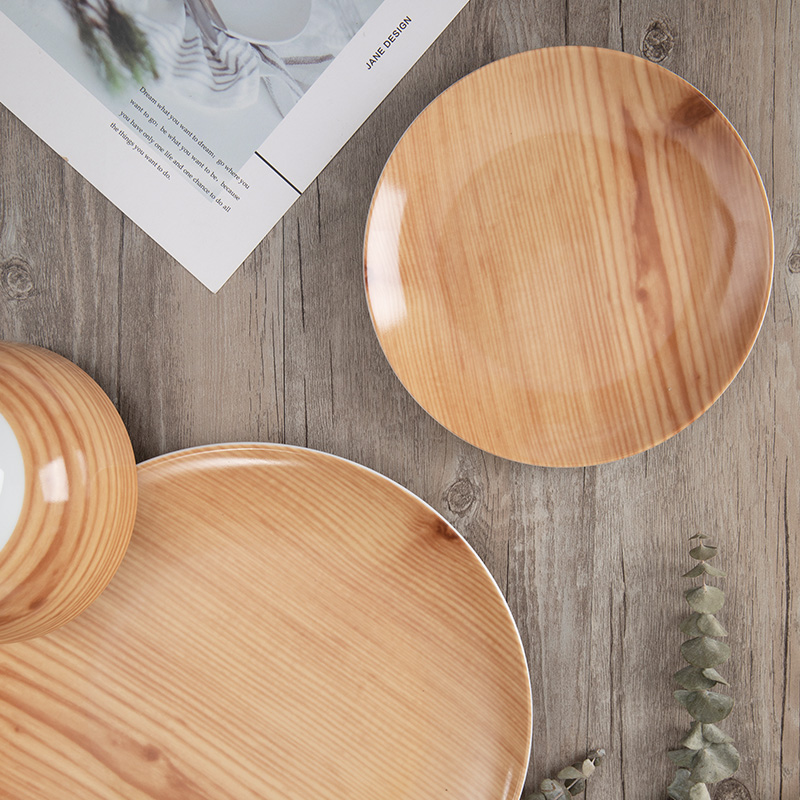 The Dinnerware Set is made of porcelain , which is sturdy enough ,Meanwhile, the unique wood color and grain makes your tableware set more gorgeous.