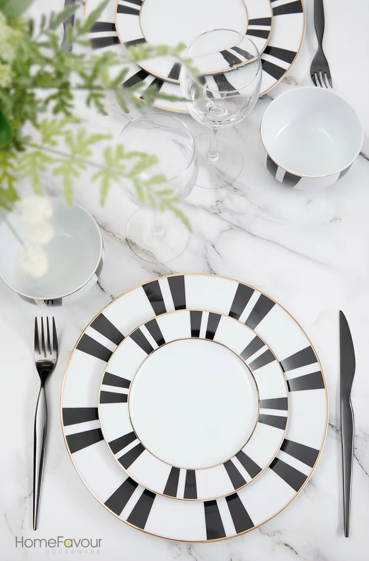Luxury Minimalist Series: Black-and-white striped tableware paired with gold accents embodies understated elegance, perfect for both everyday use and formal gatherings.